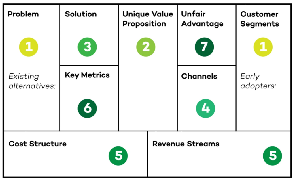 Das Lean Start Up Canvas ist ein schlankes Tool für Gründerinnen und Gründer, um ihr Geschäftsmodell zu visualisieren, zu challengen und zu verbessern. Es besteht aus neun Feldern, die alle kritischen Aspekte deines Unternehmens abdecken: